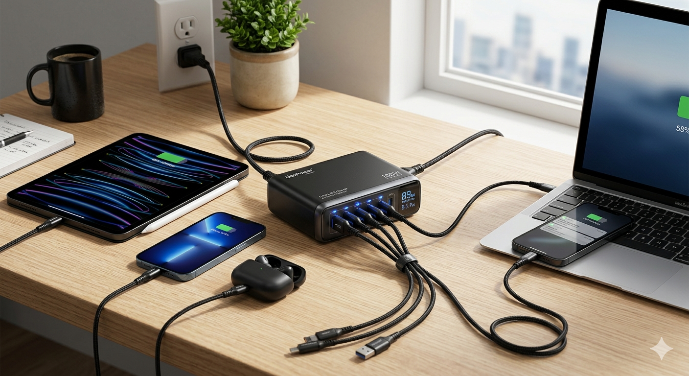 A high-speed 100W charger with three ports, delivering enough power to charge a MacBook Pro and an iPhone at the same time.